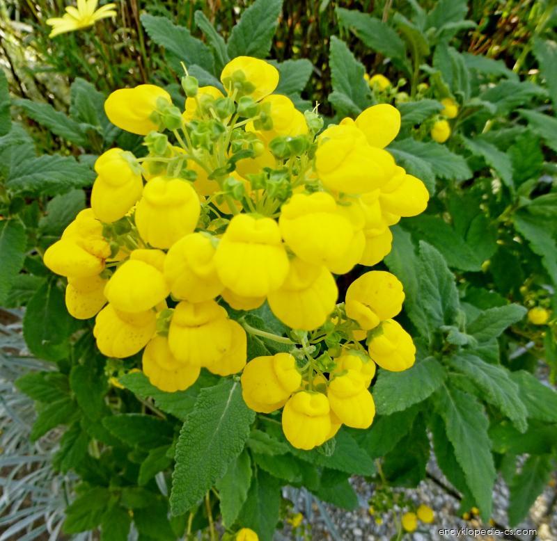 | Vzhled: jako letnička pěstovaný košatý, rozvětvený, lehce převisající polokeř; květy žluté, také načervenale skvrnité, pantoflíčkovité, v hroznech; listy podlouhle vejčité, svěže zelené ... | ||